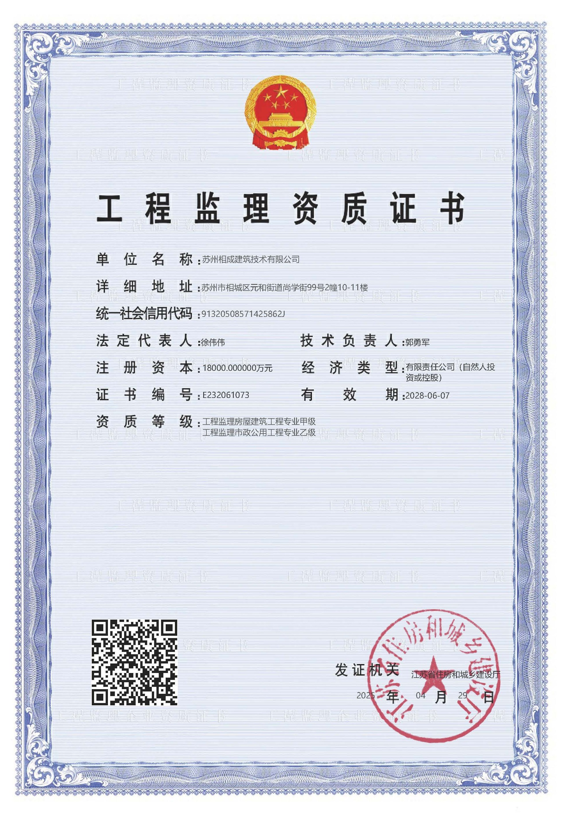 蘇州相成建筑技術(shù)有限公司是一家以提供建筑開(kāi)發(fā)服務(wù)為主的建筑企業(yè),公司位于蘇州市相城區(qū),成立于2011年3月,注冊(cè)資本 10000萬(wàn),歷經(jīng)13年的努力于2022年7月獲省住建廳頒發(fā)房屋建筑工程施工總承包壹級(jí)資質(zhì),市政公用、建筑裝飾、地基基礎(chǔ)、消防設(shè)施、鋼結(jié)構(gòu)工程等專業(yè)承包二級(jí)資質(zhì); 2023 年6月份增設(shè)房屋建筑工程監(jiān)理甲級(jí)、市政一級(jí)監(jiān)理資質(zhì);目前是相城區(qū)唯一一家集施工總承包一級(jí)和建筑工程監(jiān)理甲級(jí)資質(zhì)的企業(yè)。